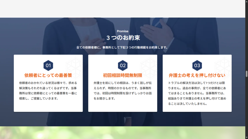 サイトを開いて3秒で、「初回相談無料」「相談時間無制限」「初期費用無料」といった、債務整理検討者が最も重視するポイントを視覚的に訴求しました。